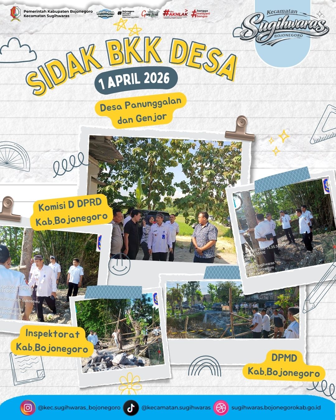SUGIHWARAS - sebagai upaya memastikan kualitas pekerjaan BKK Desa sesuai dengan ketentuan dan Kemanfaatan pembangunan bagi masyarakat, Komisi D DPRD Kabupaten Bojonegoro bersama Inspektorat, DPMD, DPU dan Kecamatan Sugihwaras melakukan sidak Pembangunan Jalan Beton di Desa Panunggalan dan Pembangunan Jembatan di Desa Genjor pada hari Rabu 1 April 2026.